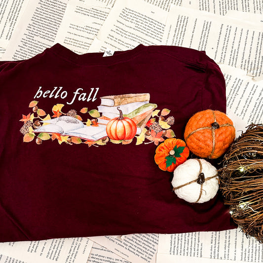 Hello Fall Red Text Autumn Themed Shirt Unisex Long Sleeve Tee