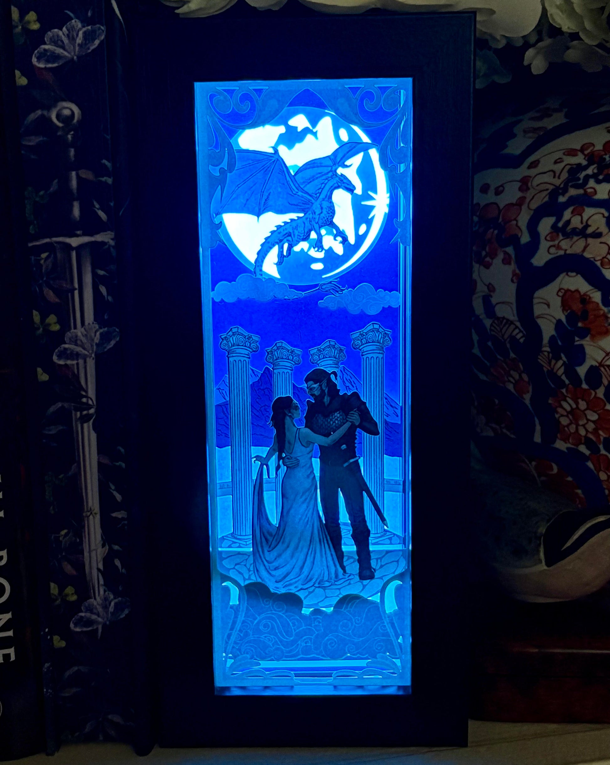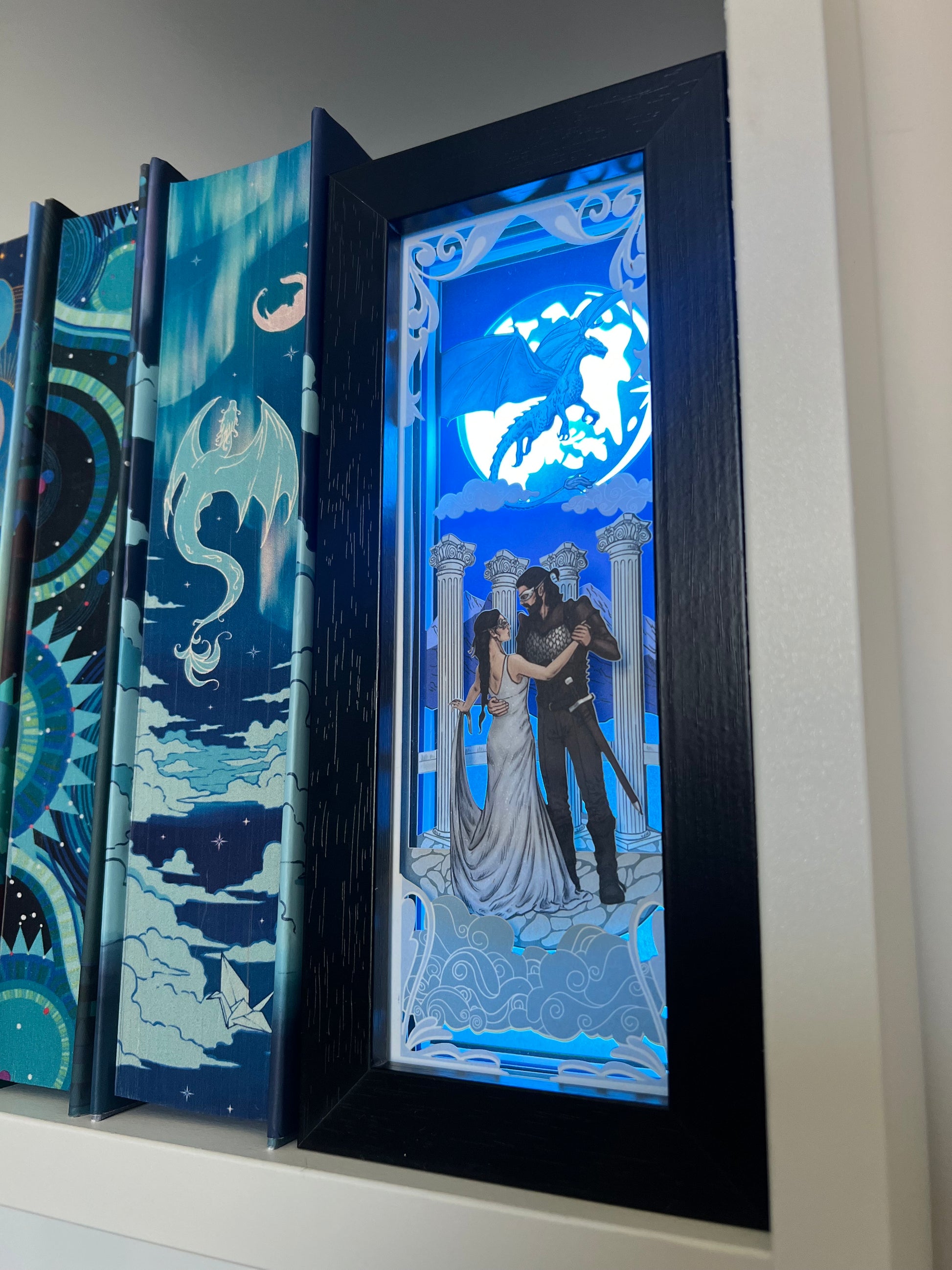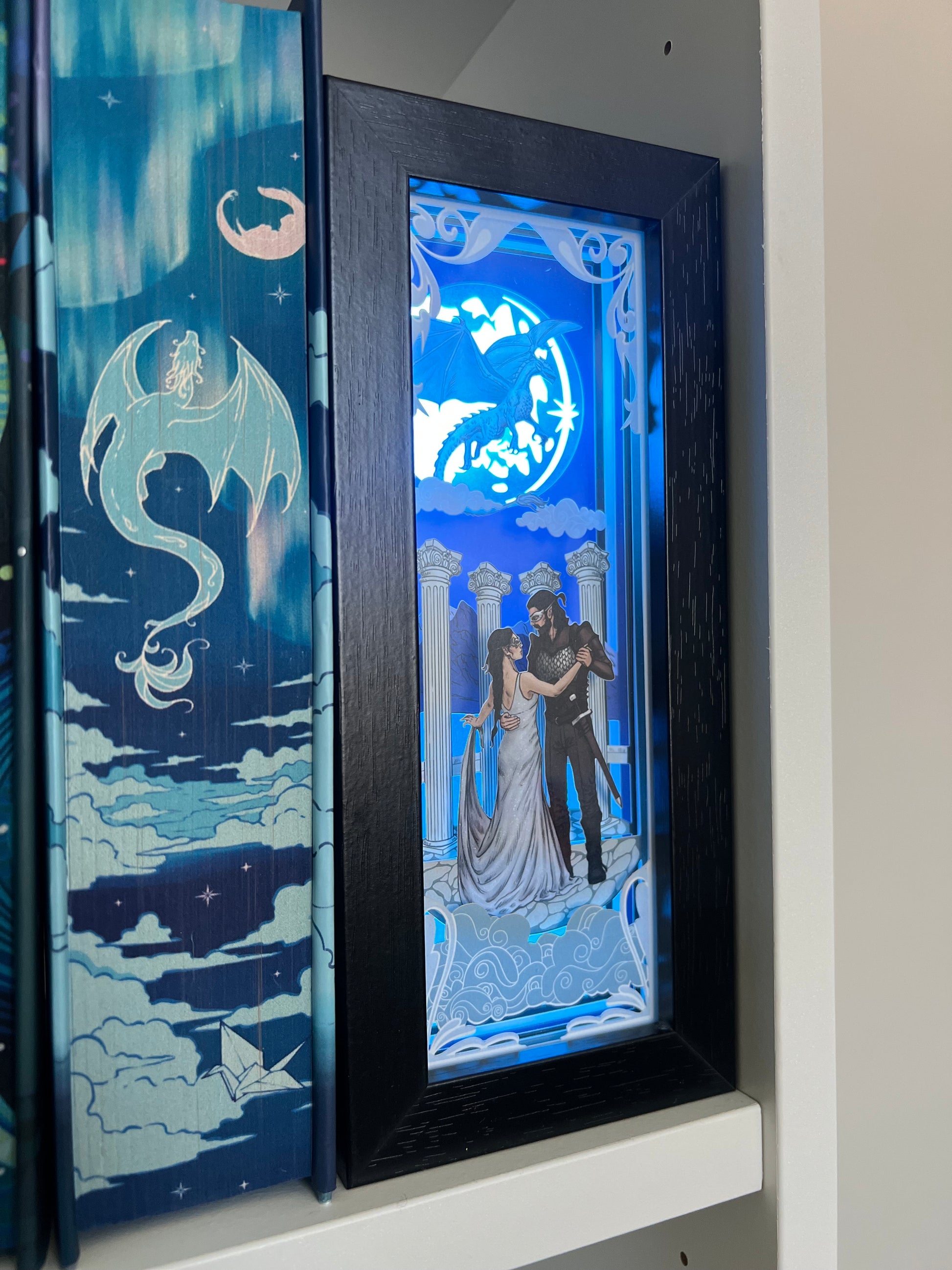 Illuminate your bookshelf with Iridescent Fairytale’s new book nook for When the Moon Hatched by Sarah A. Parker. This officially licensed lightbox includes a stunning image of Raeve and Kaan dancing in front of a majestic moonplume dragon flying in the sky.