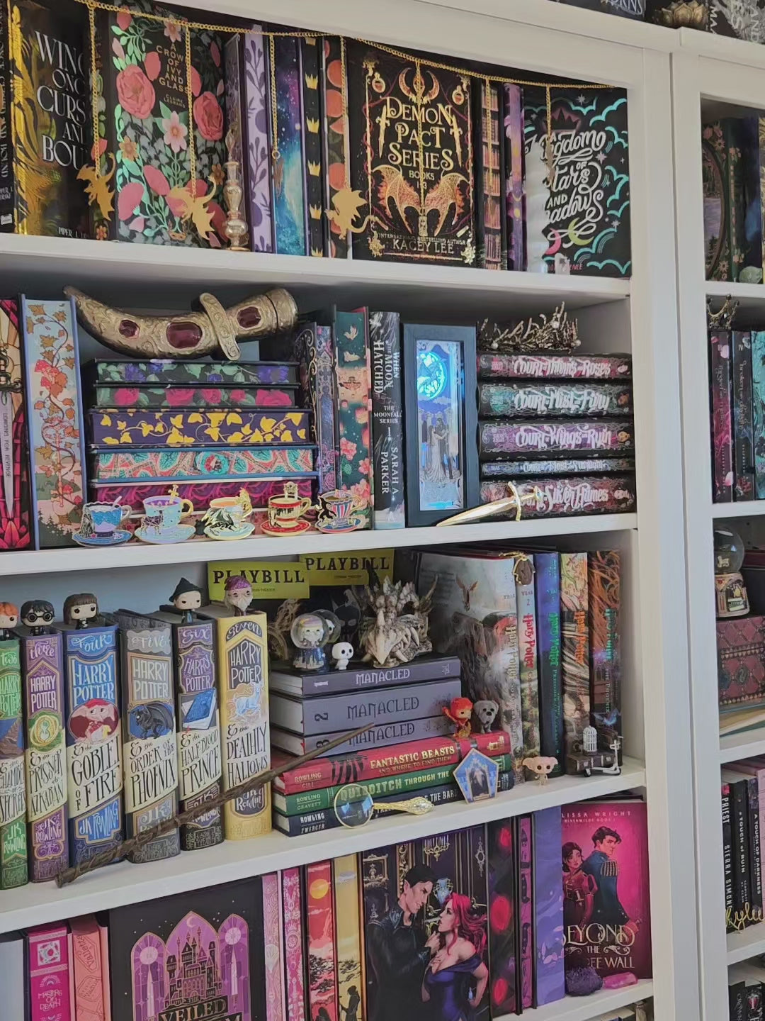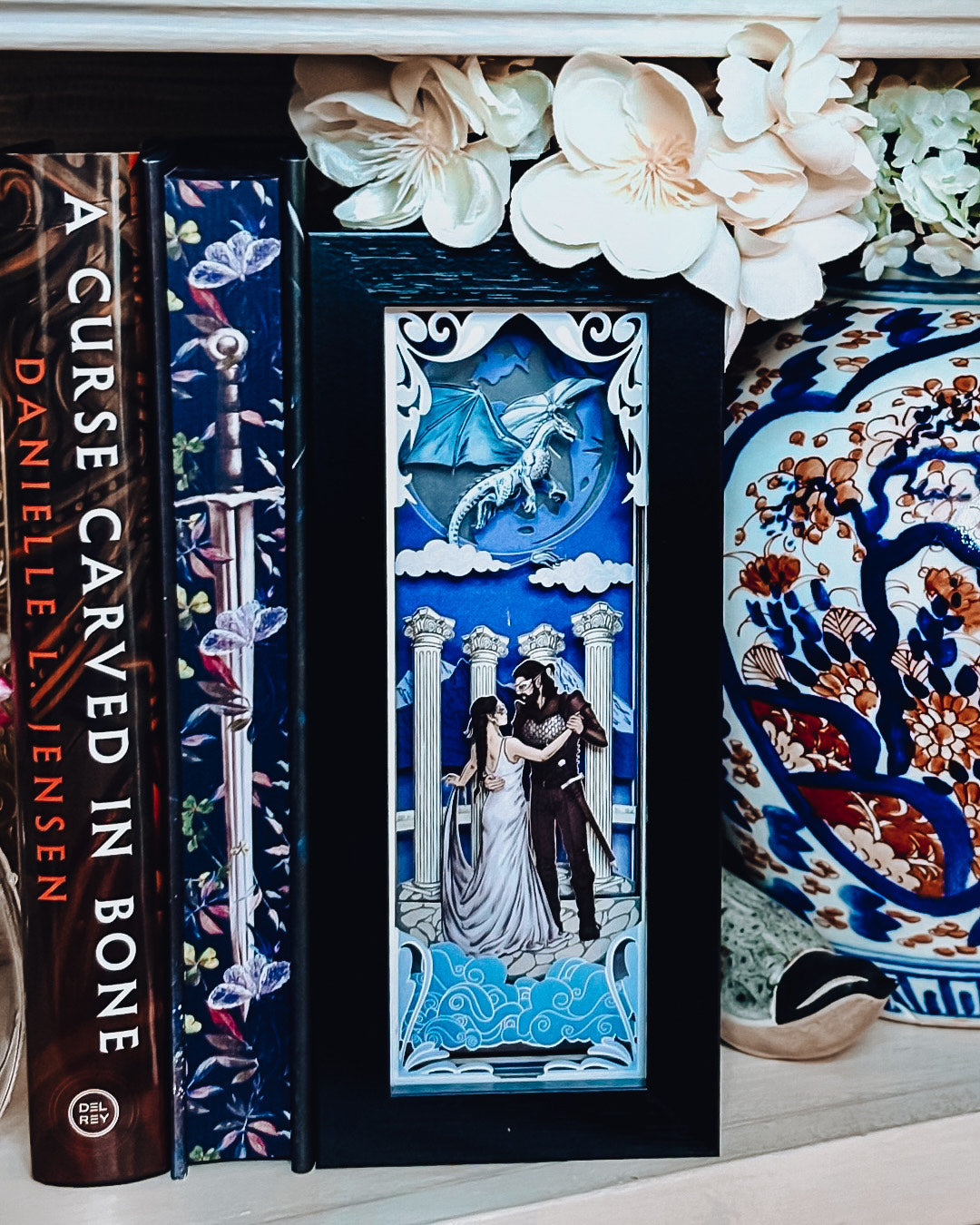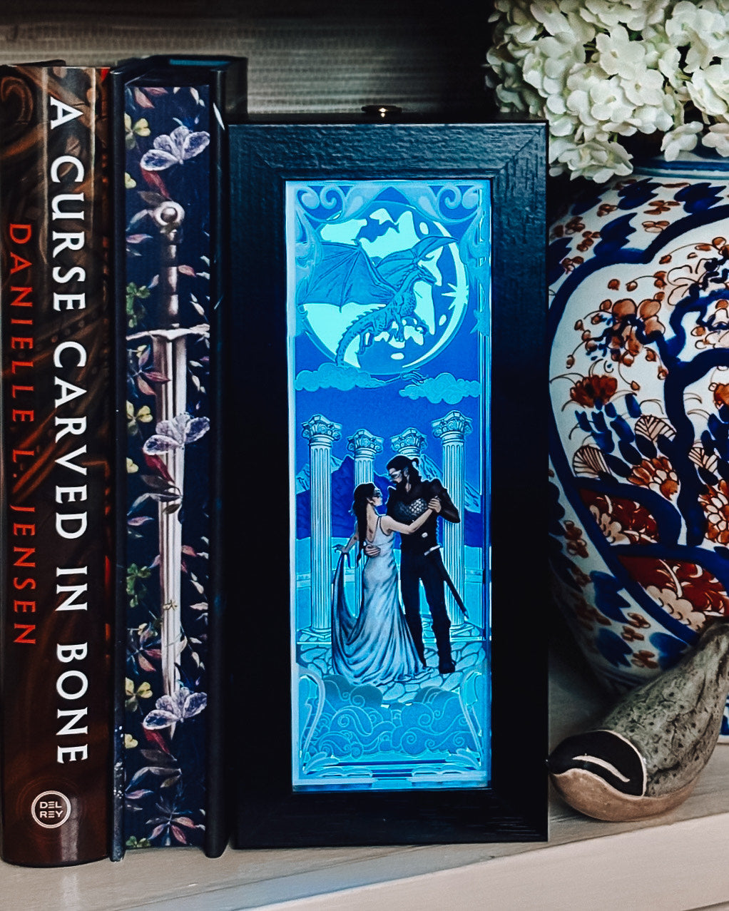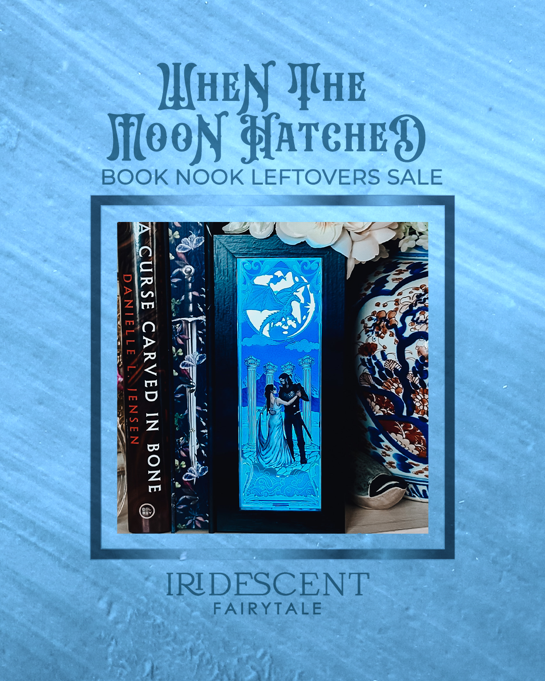 Illuminate your bookshelf with Iridescent Fairytale’s new book nook for When the Moon Hatched by Sarah A. Parker. This officially licensed lightbox includes a stunning image of Raeve and Kaan dancing in front of a majestic moonplume dragon flying in the sky.